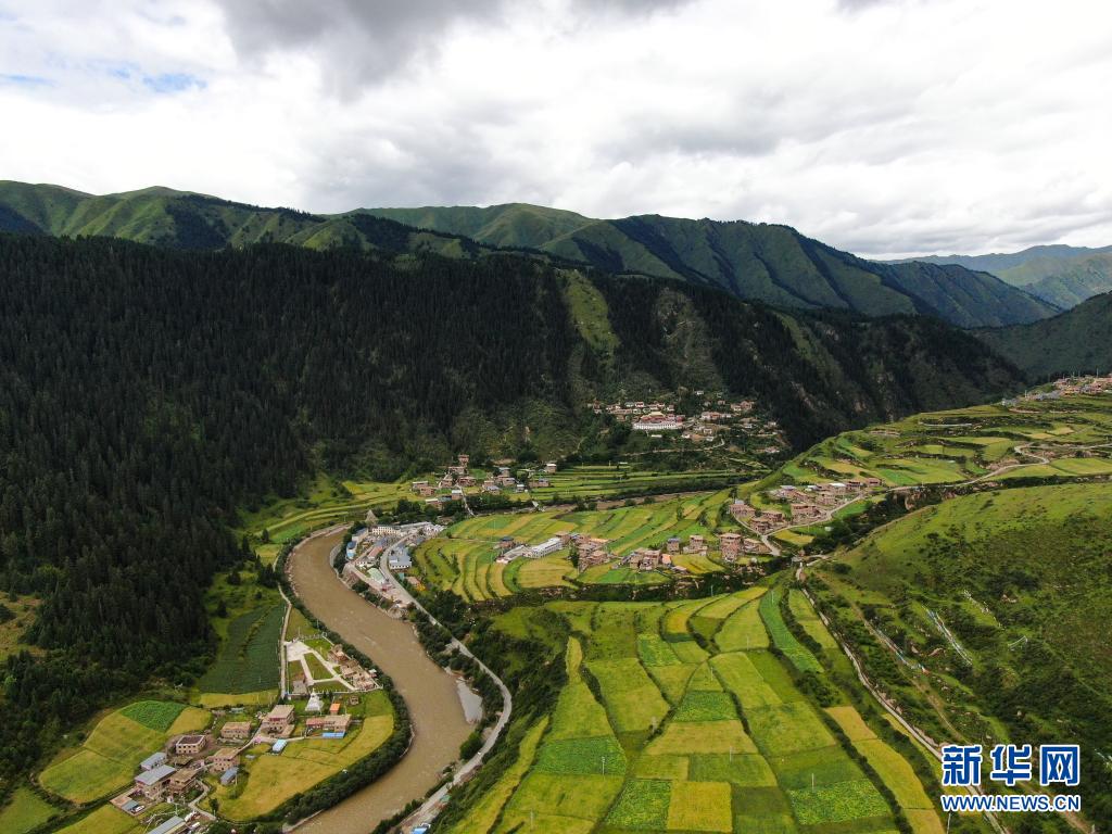 8月7日在青海省果洛藏族自治州班瑪縣境內(nèi)拍攝的村莊景色(無人機(jī)照片)。新華社記者 張龍 攝