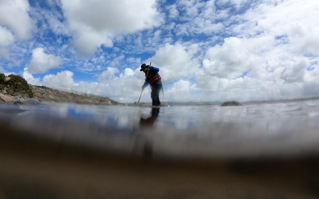 在青海省玉樹藏族自治州治多縣,長江科學(xué)院高級工程師李偉在科欠曲采集魚類樣本。新華社記者 吳剛 攝