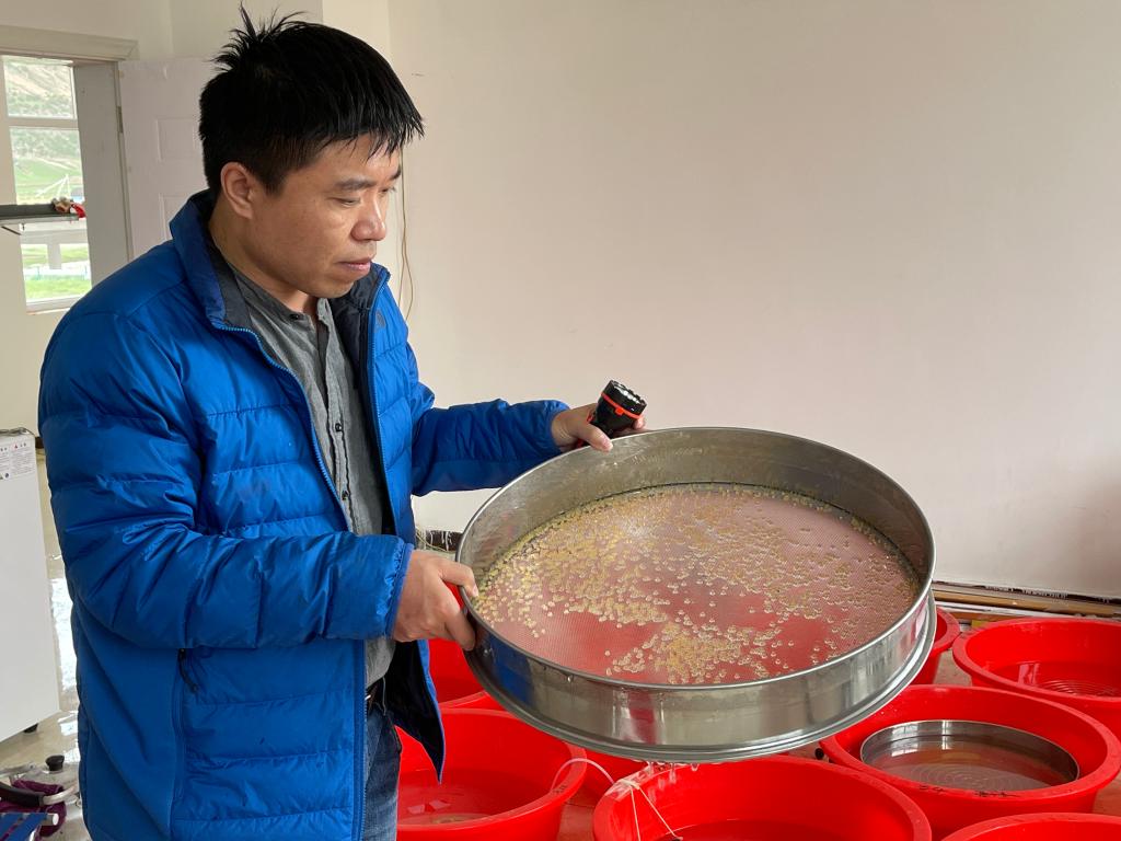 李偉正在查看孵化中的長江源關(guān)鍵魚類受精卵(6月23日攝)。