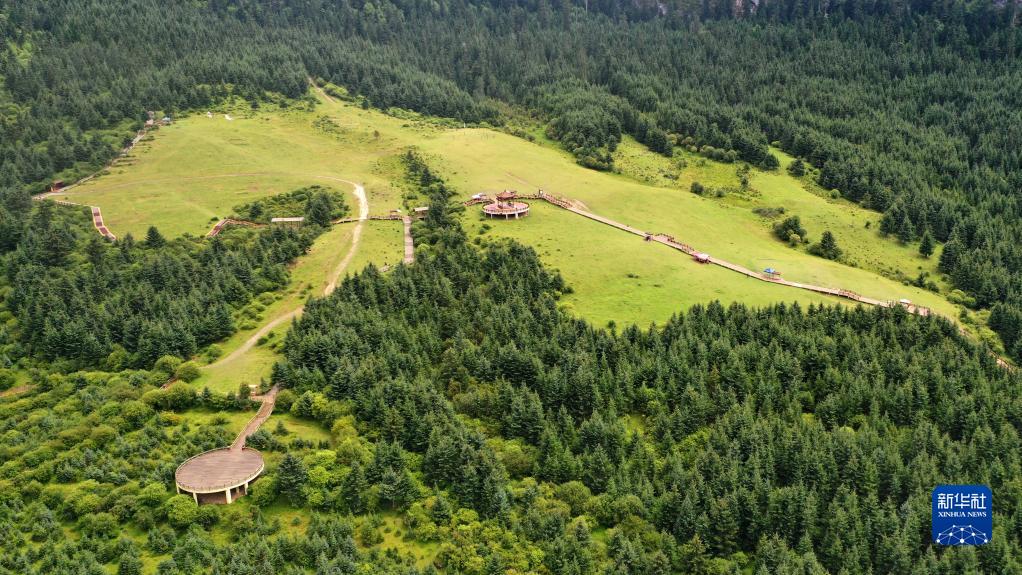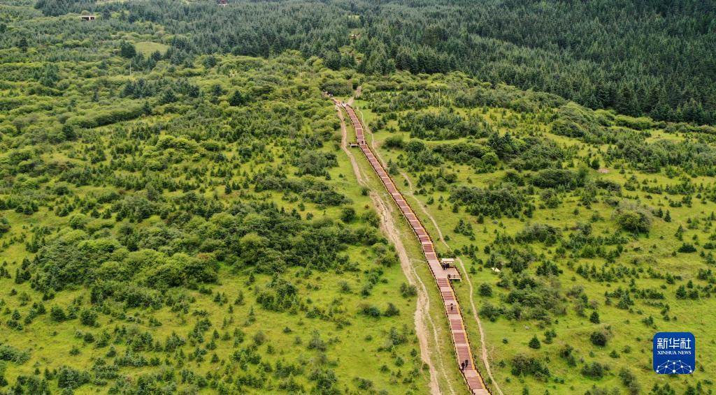 游客行走在扎尕那景區(qū)的木棧道上(8月28日攝,無人機(jī)照片)。新華社記者 杜哲宇 攝