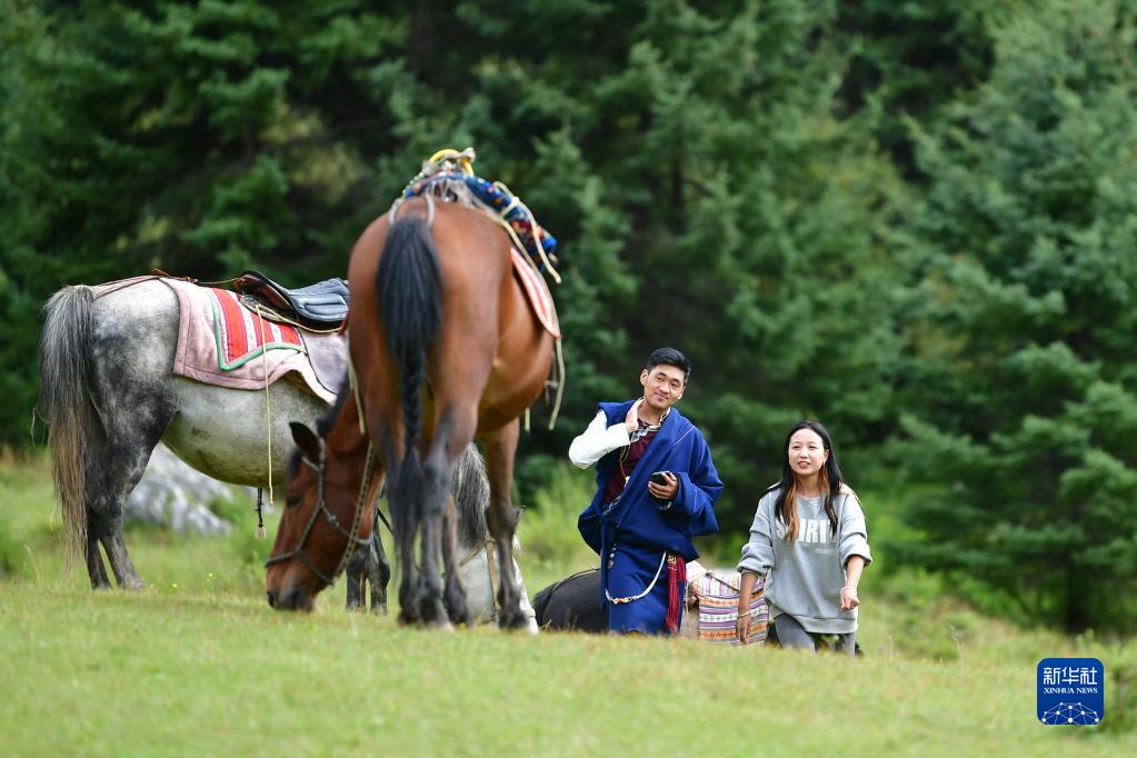 游客在扎尕那景區(qū)內(nèi)身著藏族服飾游覽(8月28日攝)。新華社記者 陳斌 攝
