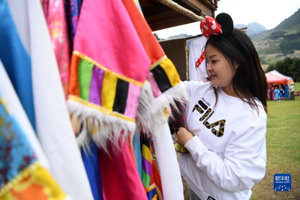 一名游客在扎尕那景區(qū)挑選藏族服飾體驗(yàn)民族風(fēng)情(8月28日攝)。新華社記者 杜哲宇 攝