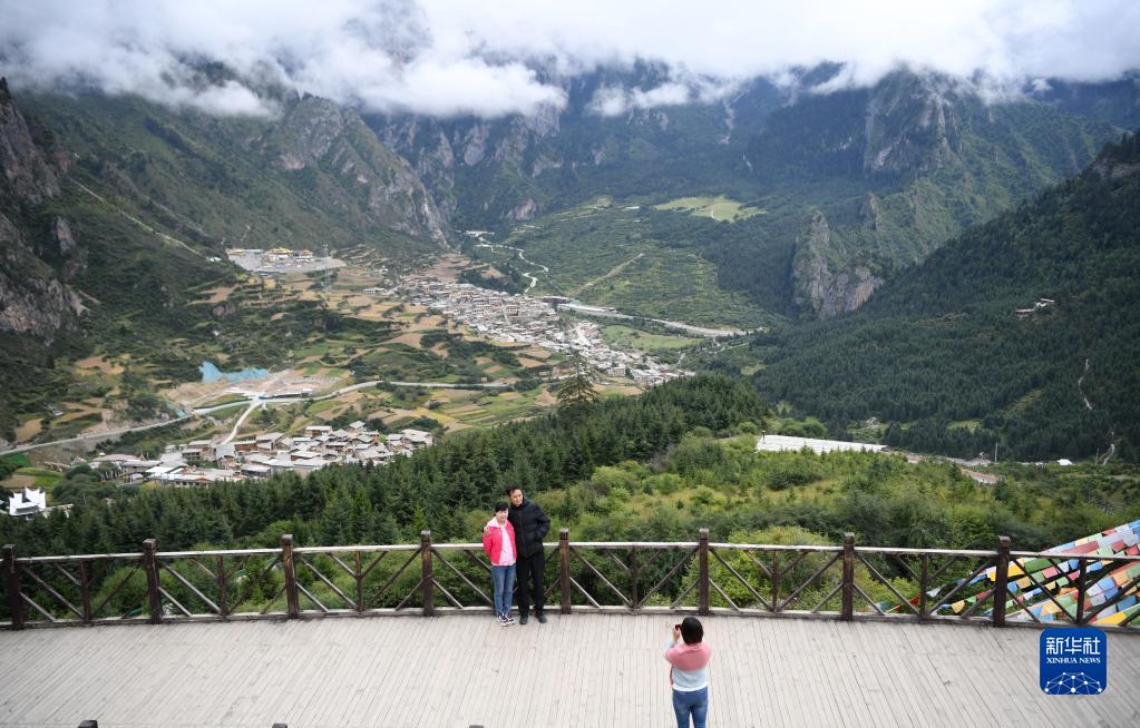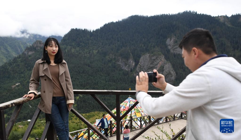游客在扎尕那景區(qū)內(nèi)的觀景臺拍照留念(8月28日攝)。新華社記者 杜哲宇 攝