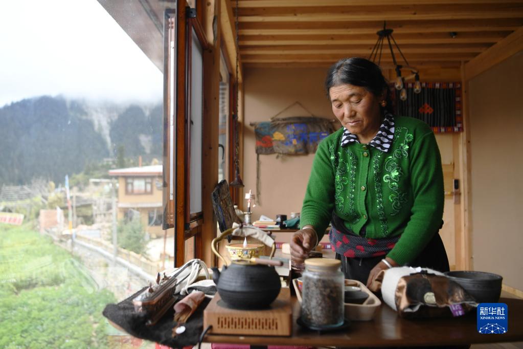 扎尕那村村民云草在自家的民宿里整理茶臺(8月28日)。新華社記者 陳斌 攝