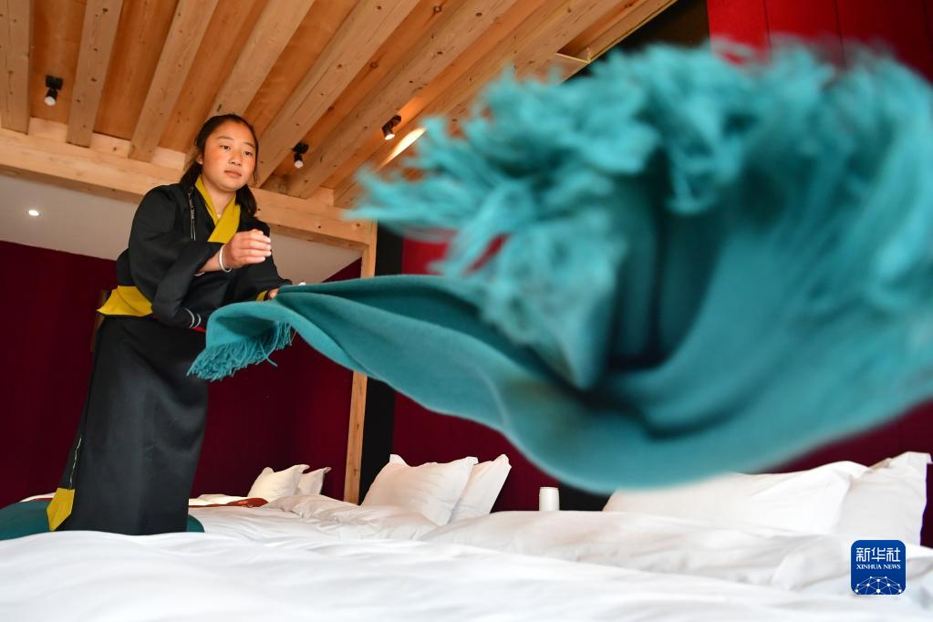 扎尕那村村民仁青卓瑪在自家的民宿里整理床鋪(8月28日)。新華社記者 陳斌 攝