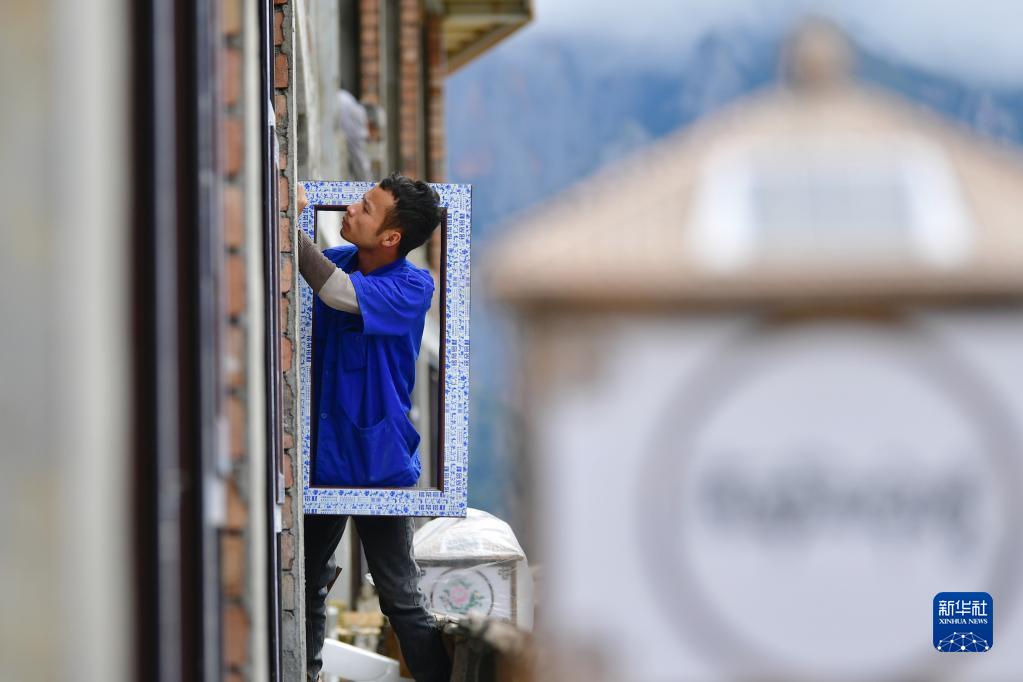 工人給扎尕那景區(qū)內(nèi)一處新建的民宿安裝窗戶(8月28日攝)。新華社記者 杜哲宇 攝