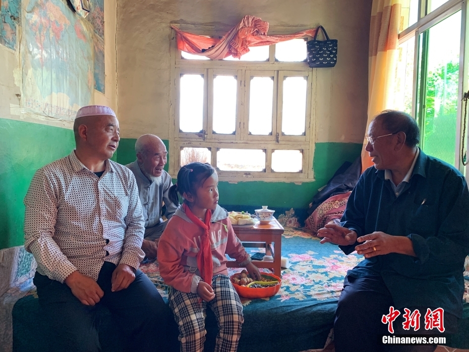 青海省海東市循化撒拉族自治縣白莊鎮(zhèn)來塘村一戶學(xué)生家,藏族教師完么仁增(右一)與學(xué)生家長交流。中新社記者 馬銘言 攝