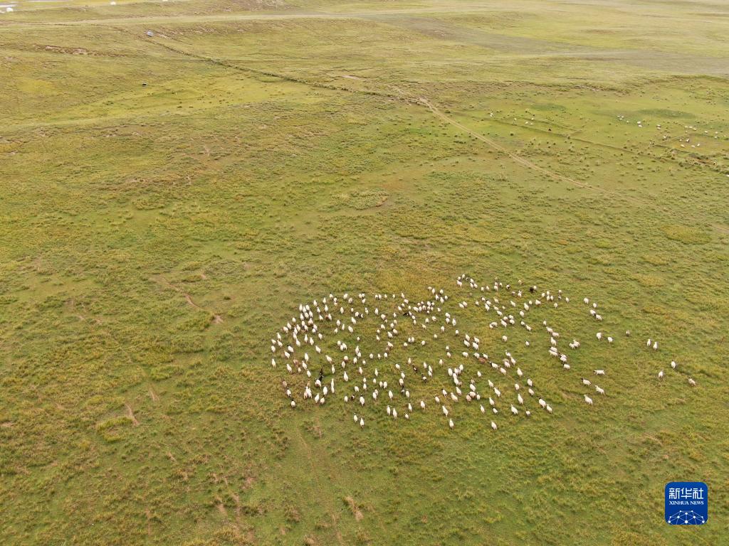 9月15日,一群羊在青海湖岸邊的牧場上覓食(無人機(jī)照片)。新華社記者 張龍 攝