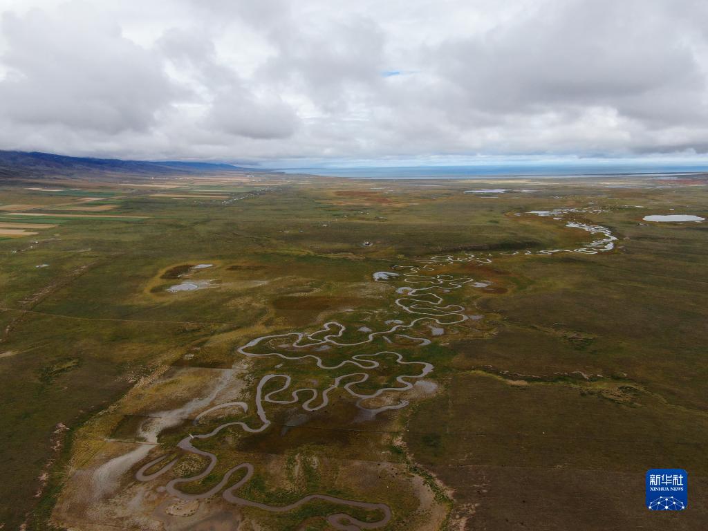這是9月15日拍攝的青海湖畔的倒淌河(無人機(jī)照片)。新華社記者 張龍 攝