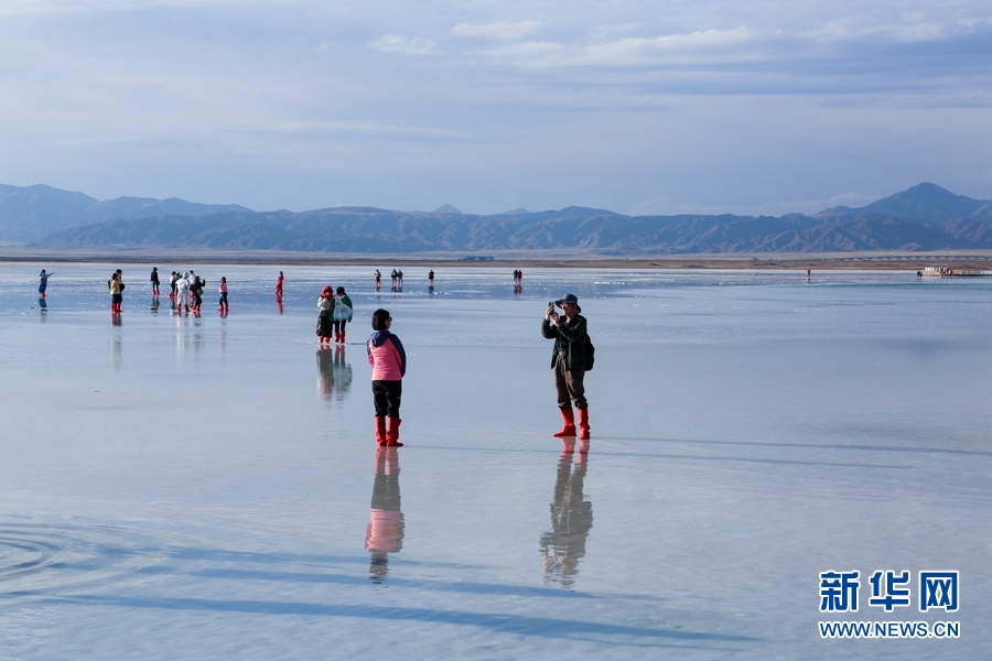 游客在茶卡鹽湖“天空之鏡”景區(qū)漫步。新華網(wǎng) 卡婭梅朵 攝