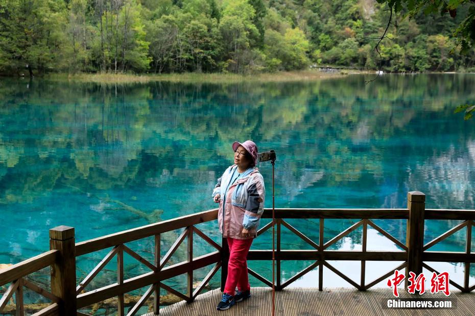 9月27日,四川阿壩,游客在九寨溝景區(qū)自拍留影。王磊 攝