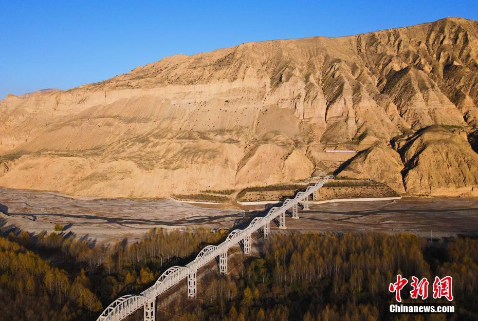 10月16日,航拍青海省海南藏族自治州貴德縣拉西瓦灌溉工程中建設(shè)的渡槽。中新社記者 馬銘言 攝