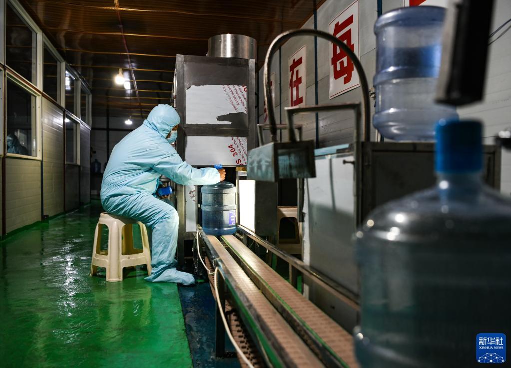 在四川省甘孜藏族自治州白玉縣打乙西村,工人正在桶裝水廠生產(chǎn)線上工作。新華社記者王曦 攝