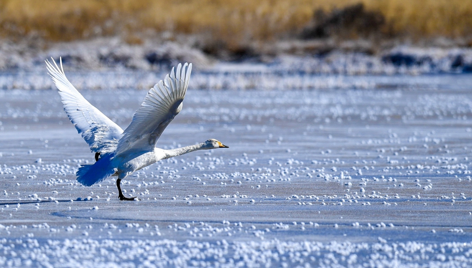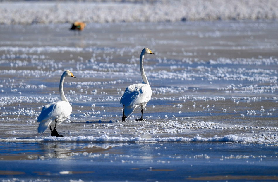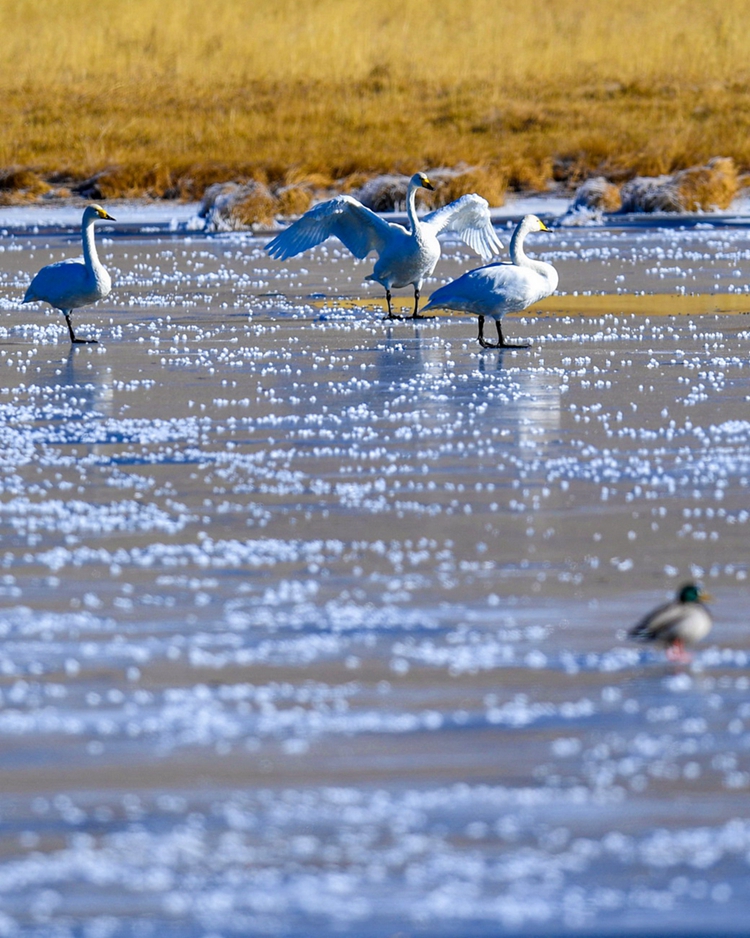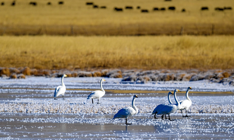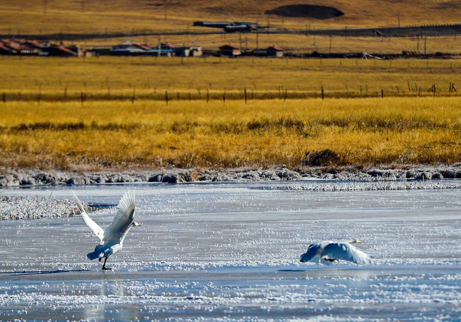 入冬以來,甘肅省甘南藏族自治州碌曲縣尕海濕地越冬的大天鵝浴雪歡歌,翩翩起舞,成為草原上一道獨特的風(fēng)景。