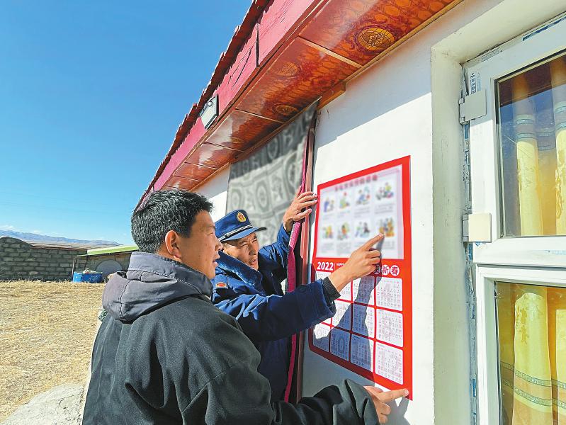 索郎更波(右)給牧民講解牧區(qū)消防知識(shí)。 阿壩州消防救援支隊(duì)供圖