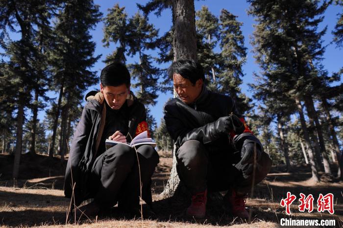 “每天和同事至少要巡護兩趟。早些年從管護站到林場只能靠步行,早晨天不亮就出發(fā)。現(xiàn)在,每次巡邏都能和會騎摩托車的同事一起,方便多了。”桑杰加沿著蜿蜒的小路,往林場深處走去,巡護中,看見一棵樹體上有大片樹皮開裂,桑杰加立即上前檢查是否有凍害、蟲口等。
