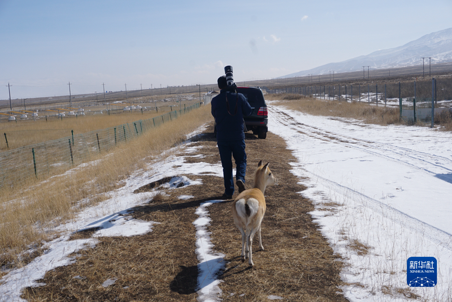 2月11日,吳永林正在和普氏原羚“東東”一起在保護站內(nèi)巡查。新華社記者 周盛盛 攝
