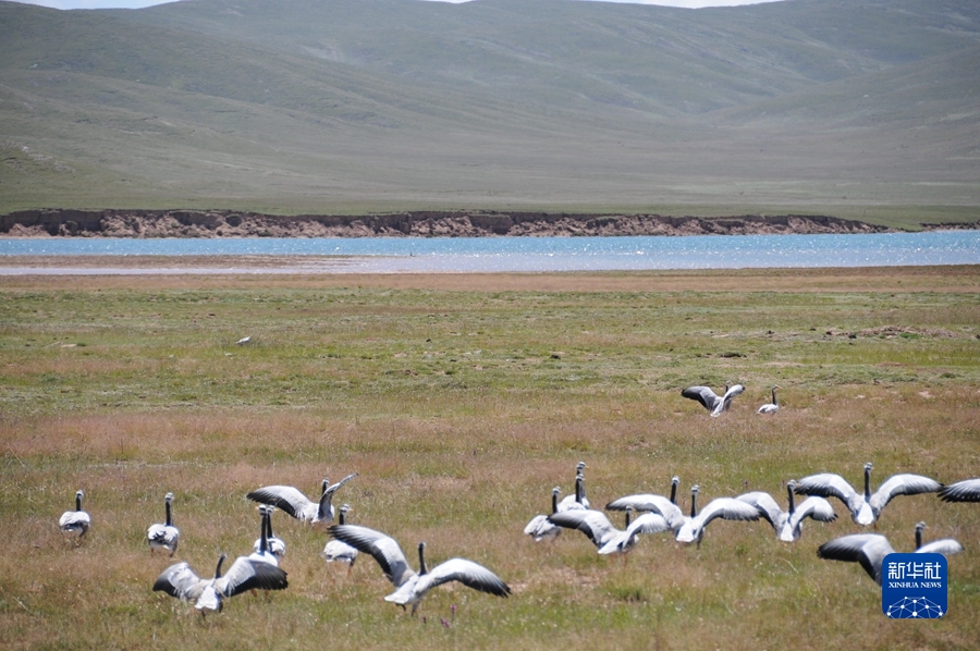 2020年8月19日,在三江源國家公園黃河源園區(qū)內,一群斑頭雁在黃河邊草地上翩然起飛。新華社記者 呂雪莉 攝