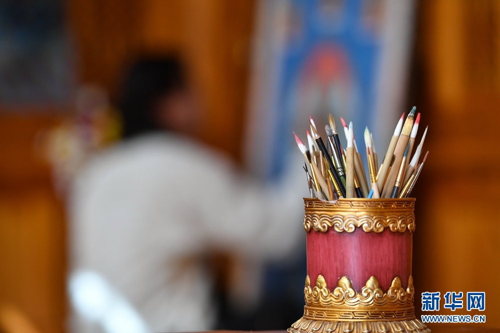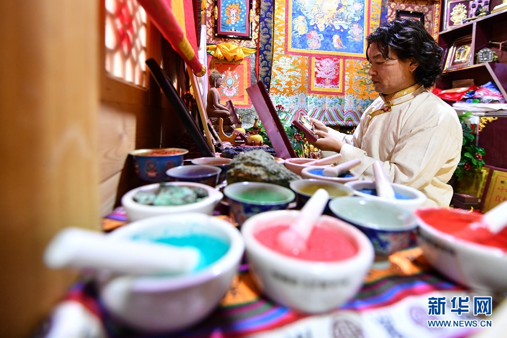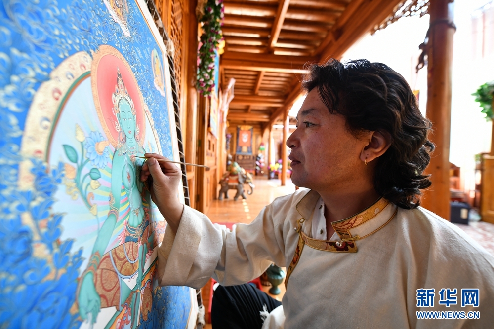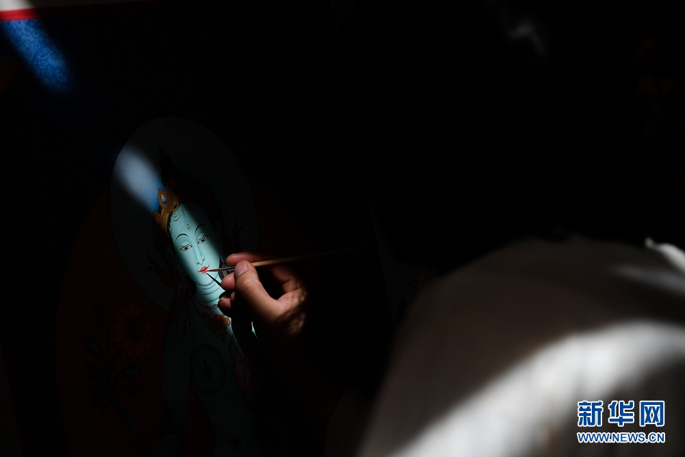 為了更好地傳承和發(fā)揚(yáng)熱貢唐卡繪畫(huà)技藝,格桑嘉措又相繼拜多名唐卡大師為師,虛心接受指導(dǎo),刻苦練習(xí)唐卡技藝,將大師們高超的繪畫(huà)技藝與家傳技藝融會(huì)貫通,使得他的繪畫(huà)功底得到了很大的提升。圖為格桑嘉措在繪制唐卡作品。