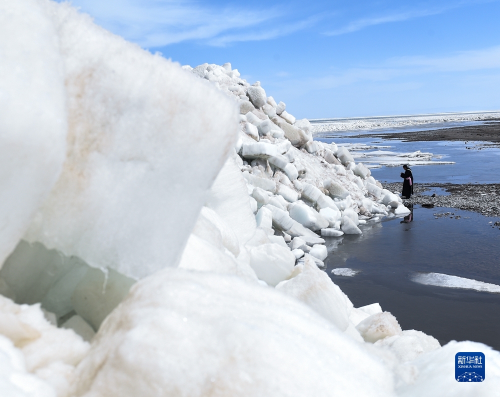3月19日,在青海湖邊,一位當(dāng)?shù)啬撩裨谂臄z堆積在岸邊的湖冰。新華社記者 張龍 攝