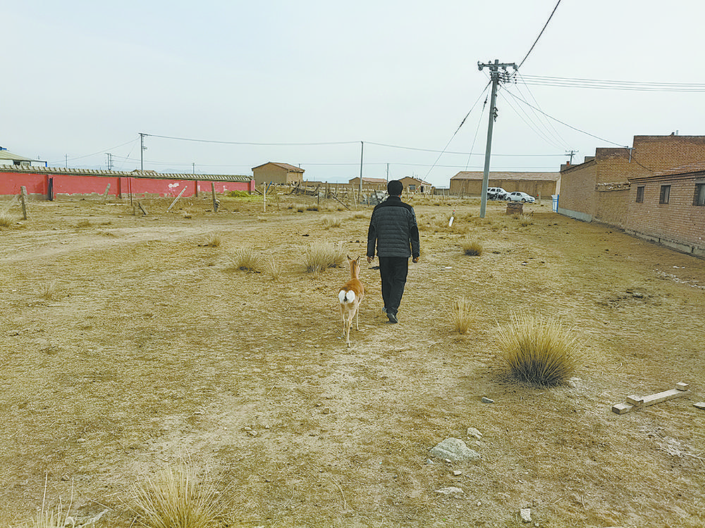 半個(gè)多月來(lái),盡管我們已經(jīng)習(xí)慣了目睹一只普氏原羚與牧人形影不離的場(chǎng)景,但每當(dāng)凝望那片草色枯黃的原野,牧人周增本無(wú)論走向何處,一只小原羚總是在6、7米外不緊不慢地跟隨著他,心里便會(huì)涌起一種無(wú)以名狀的感動(dòng),不禁令人熱淚盈眶。