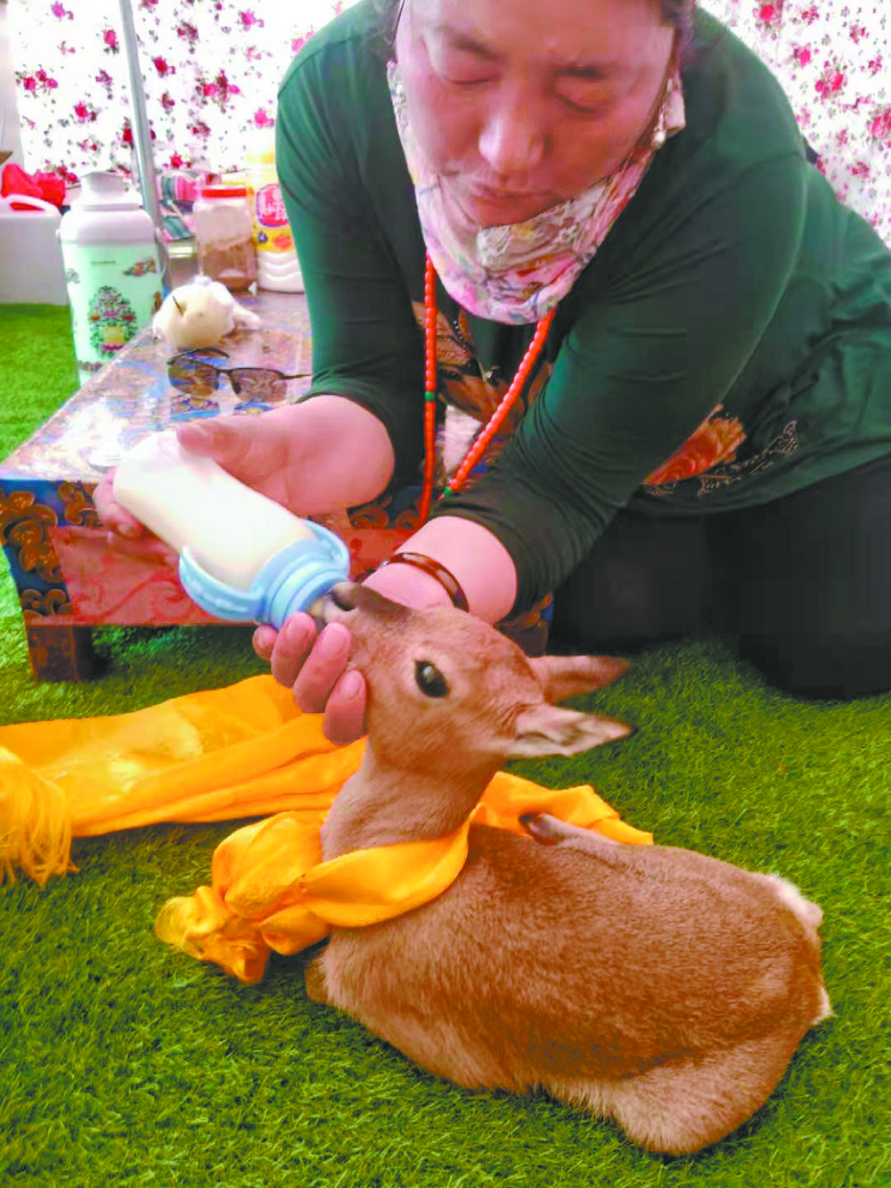 妻子扎西卓瑪始終沒有放棄喂養(yǎng)它,最初的3天,她每天都要花6個(gè)多小時(shí),或跪著或趴著,把奶嘴一次次伸進(jìn)“豆豆”口中,但又一次次被吐了出來(lái)。一家人整夜操心,輪流給它喂水喂奶,扎西卓瑪還在它的脖子上系了一條黃色的哈達(dá),當(dāng)做“幸運(yùn)結(jié)”,希望小原羚能活下來(lái)。