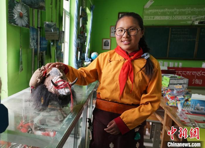 圖為學生展示用牛糞和牛毛制作的牦牛擺件。馬銘言 攝