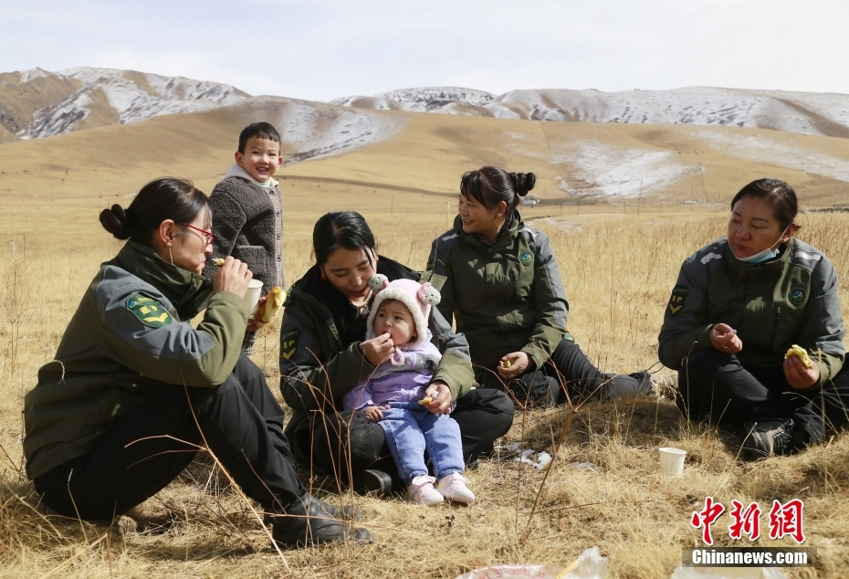 在巡護(hù)了一大片林地后,大家聚到一起休息。草原上席地而坐,背著只有11個(gè)月大的女兒的索南吉放下孩子,小扎西拿著風(fēng)鈴逗著妹妹。一壺清茶、一袋干糧、兩個(gè)孩子,一群女子交流著巡護(hù)情況,不時(shí)也會(huì)傳出開(kāi)心的笑聲。