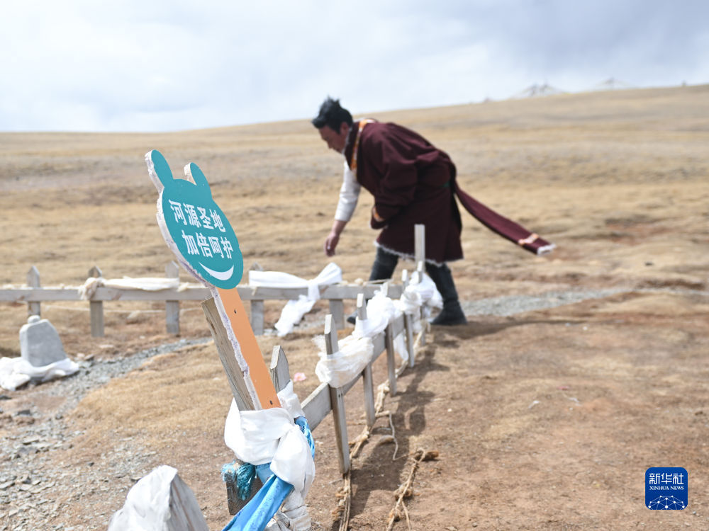 4月21日,在青海省玉樹藏族自治州曲麻萊縣麻多鄉(xiāng)約古宗列曲附近,生態(tài)管護員格桑東周在整理黃河源頭的柵欄。新華社記者 張龍 攝