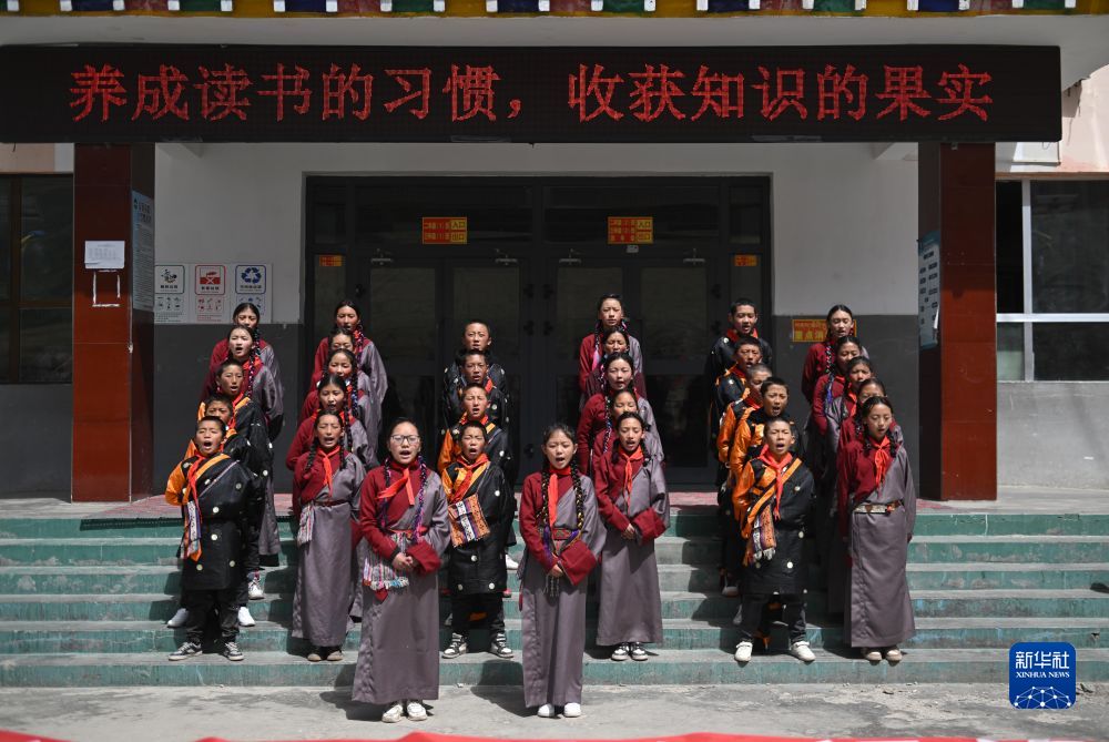 4月22日,青海省玉樹(shù)藏族自治州曲麻萊縣巴干鄉(xiāng)寄宿制小學(xué)的學(xué)生在學(xué)校組織的“世界讀書(shū)日”活動(dòng)中誦讀經(jīng)典。新華社記者 張龍 攝