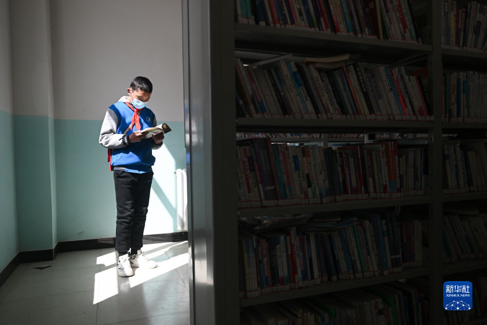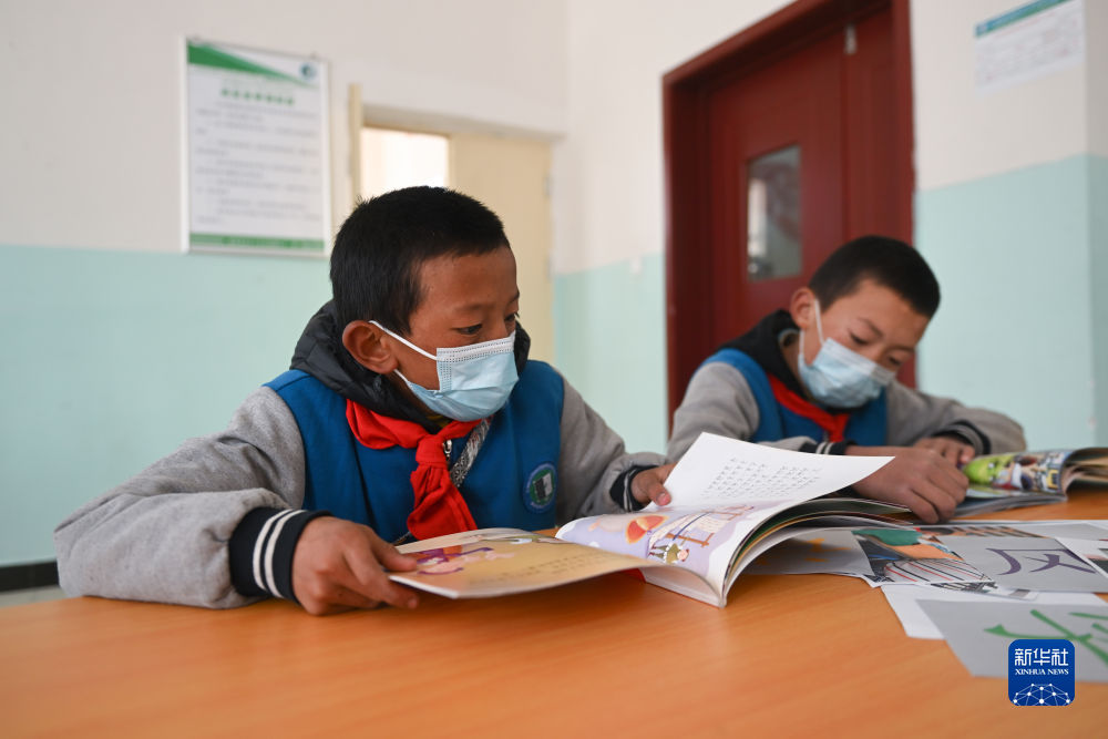 4月22日,青海省玉樹(shù)藏族自治州曲麻萊縣巴干鄉(xiāng)寄宿制小學(xué)的學(xué)生在圖書(shū)室內(nèi)閱讀。新華社記者 張龍 攝