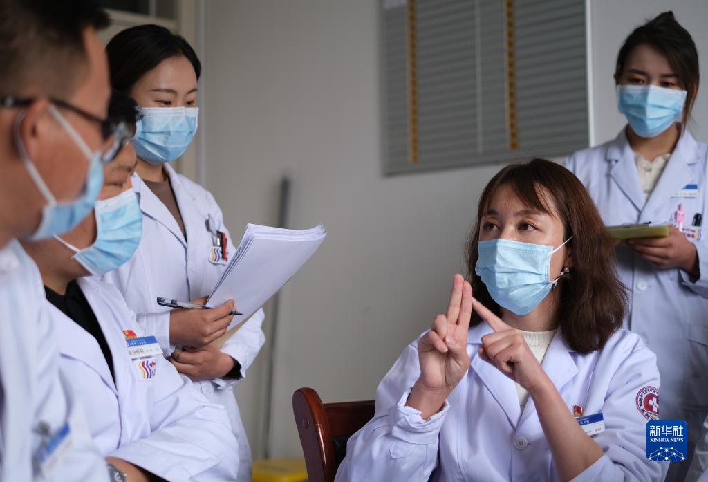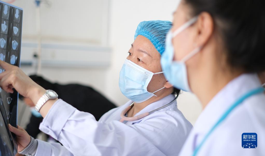 4月25日,青海省人民醫(yī)院醫(yī)生、青南支醫(yī)隊(duì)員謝延玲(右二)和青海省玉樹藏族自治州人民醫(yī)院醫(yī)生探討患者病情。新華社記者 央秀達(dá)珍 攝