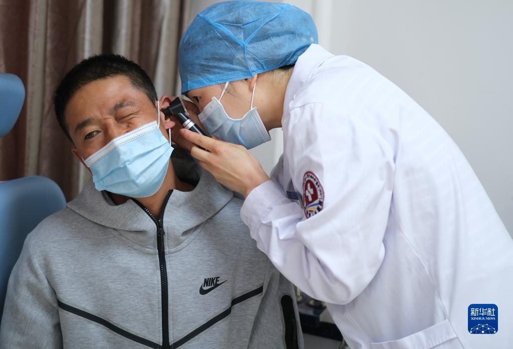 4月25日,青海省婦女兒童醫(yī)院醫(yī)生、青南支醫(yī)隊(duì)員孫敬在青海省玉樹藏族自治州人民醫(yī)院給患者檢查身體。新華社記者 韓方方 攝