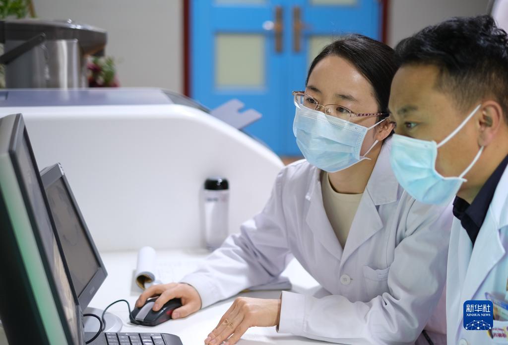 4月25日,青海省婦女兒童醫(yī)院醫(yī)生、青南支醫(yī)隊(duì)員孫敬(左)給青海省玉樹藏族自治州人民醫(yī)院醫(yī)生講解患者胸部CT。新華社記者 央秀達(dá)珍 攝