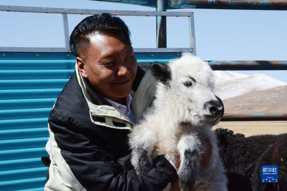 尼瑪才仁和小牛犢在一起(4月20日攝)。新華社記者 張龍 攝