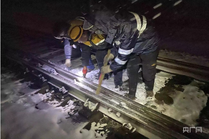 深夜風(fēng)雪中,清掃道岔滑床板。央廣網(wǎng)發(fā) 余國(guó)棟 攝