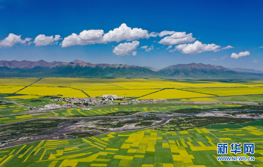 金黃色的油菜花在藍天白云映襯下,宛如一幅壯麗畫卷。新華網 宋忠勇 攝