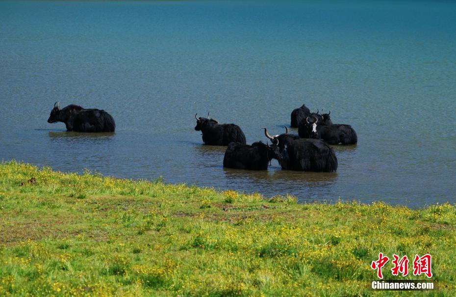 圖為牦牛在年寶玉則湖中嬉戲。馬銘言 攝