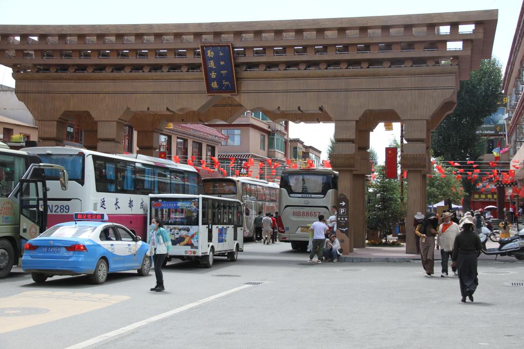 旅游包車游客進(jìn)入理塘縣勒通古鎮(zhèn)景區(qū)。(理塘縣委宣傳部供圖)