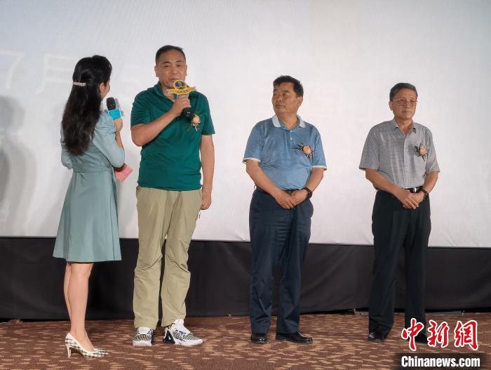 圖為總導演李曉、主演葛玉修,參與電影創(chuàng)作的廣電協會會長韓青峰接受采訪。祁增蓓 攝