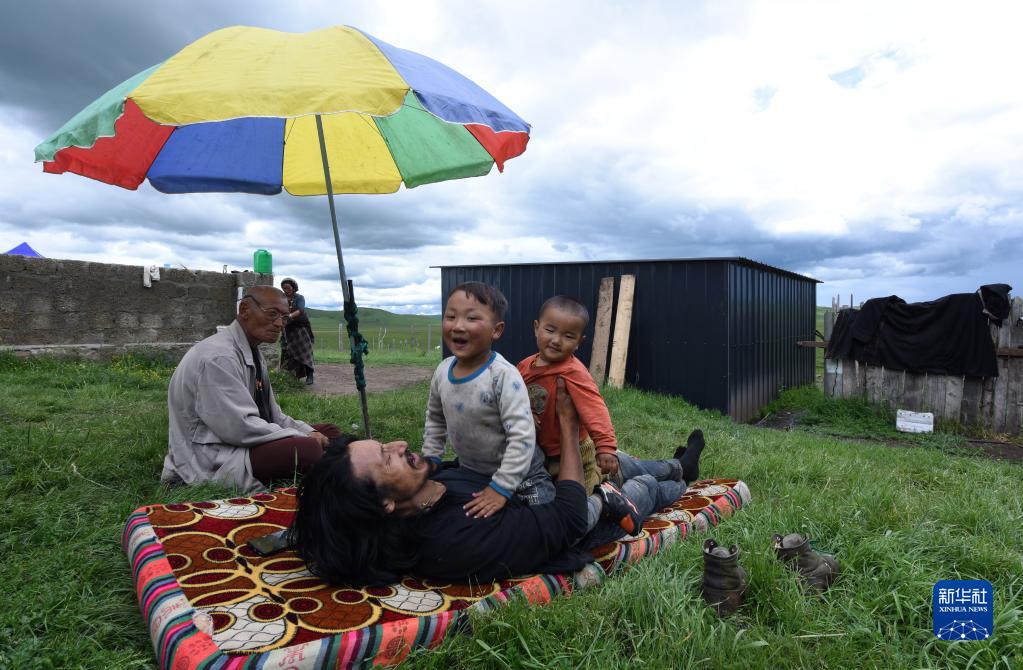 7月13日,巴周和兩個(gè)外孫在遠(yuǎn)牧點(diǎn)玩耍。新華社記者 陳燮 攝