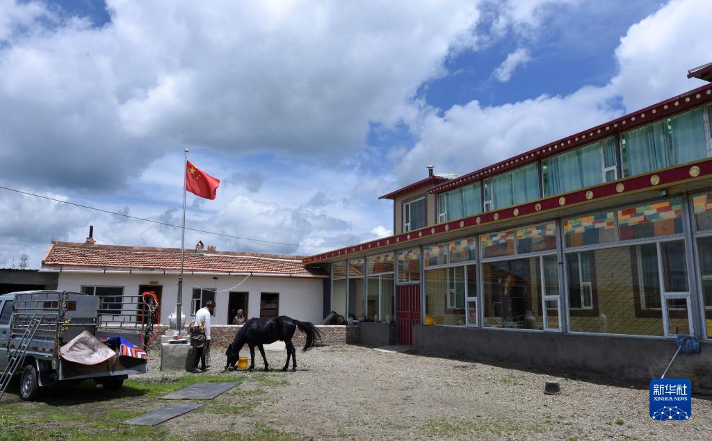 7月15日,巴周的女婿扎西在定居點(diǎn)家里給馬喂水。畫面中的兩層小樓是三年前新建的。新華社記者 陳燮 攝
