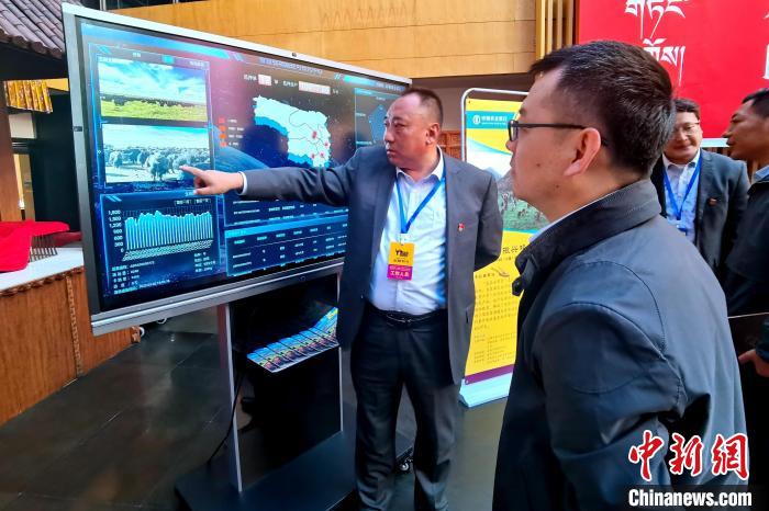 圖為工作人員為客商介紹玉樹(shù)牦牛智慧牧場(chǎng)系統(tǒng)。李雋 攝