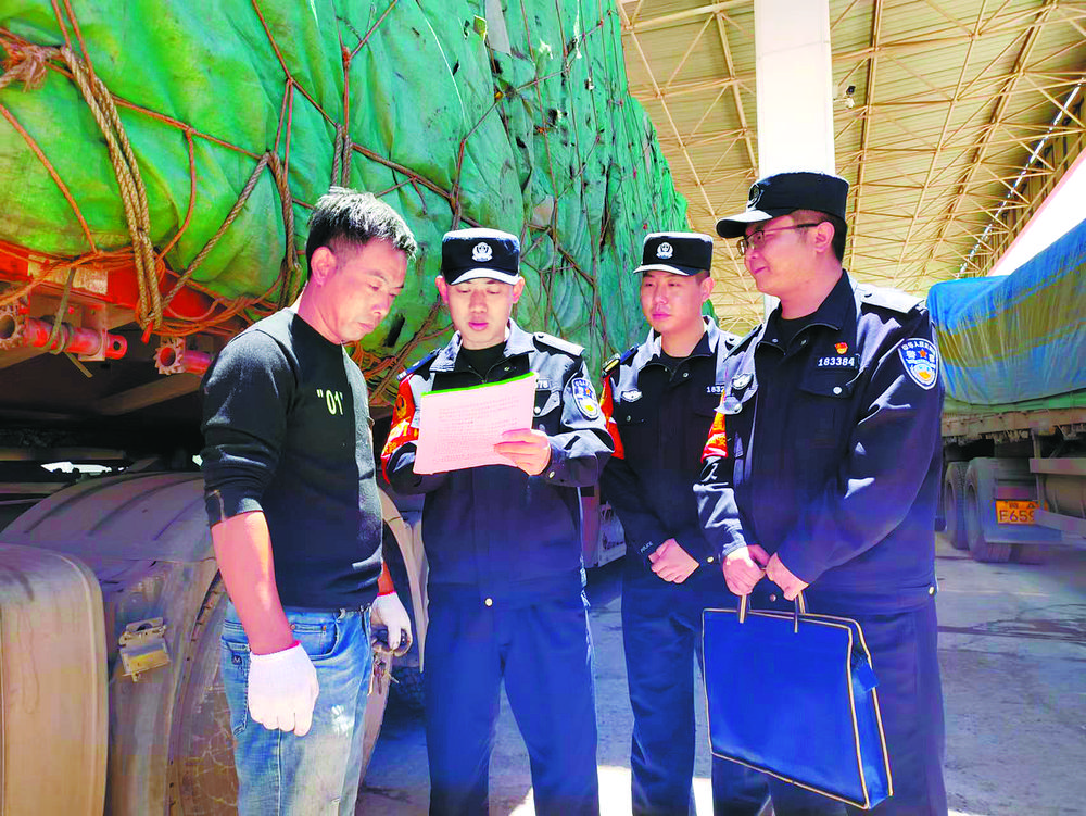 沱沱河站派出所所長沈衛(wèi)平(左二)和民警們一起向客車司機(jī)宣傳愛路護(hù)路知識(shí)。青藏鐵路公安局格爾木公安處供圖