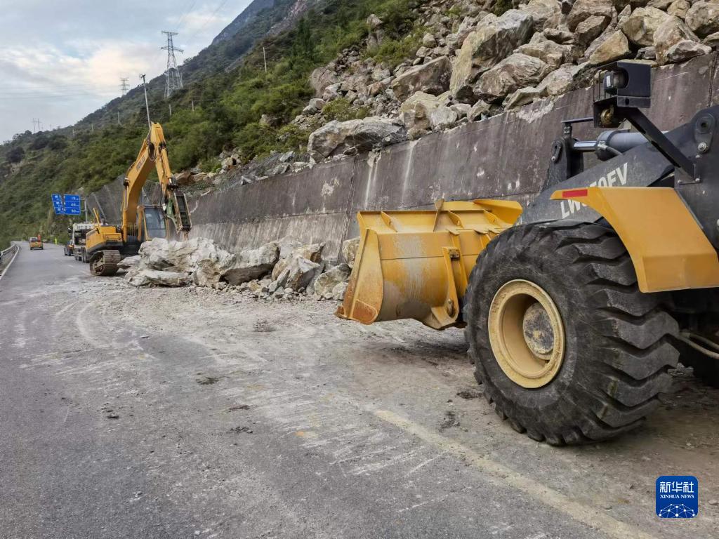 9月6日上午,工程機(jī)械在省道S217線瀘石路快速通道K30二里壩段進(jìn)行搶通作業(yè)。新華社發(fā)