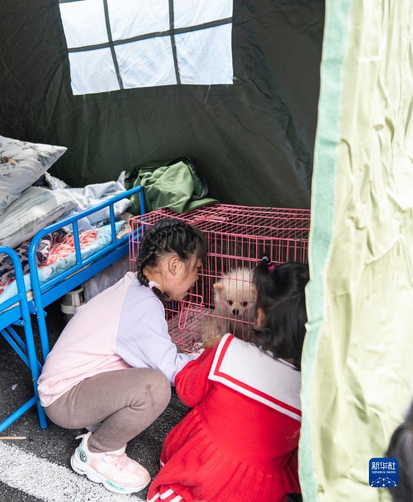 9月6日,在四川甘孜州瀘定縣磨西鎮(zhèn)海螺溝廣場(chǎng)受災(zāi)群眾臨時(shí)安置點(diǎn),兒童與從家中帶過來的小狗玩耍。新華社記者 才揚(yáng) 攝