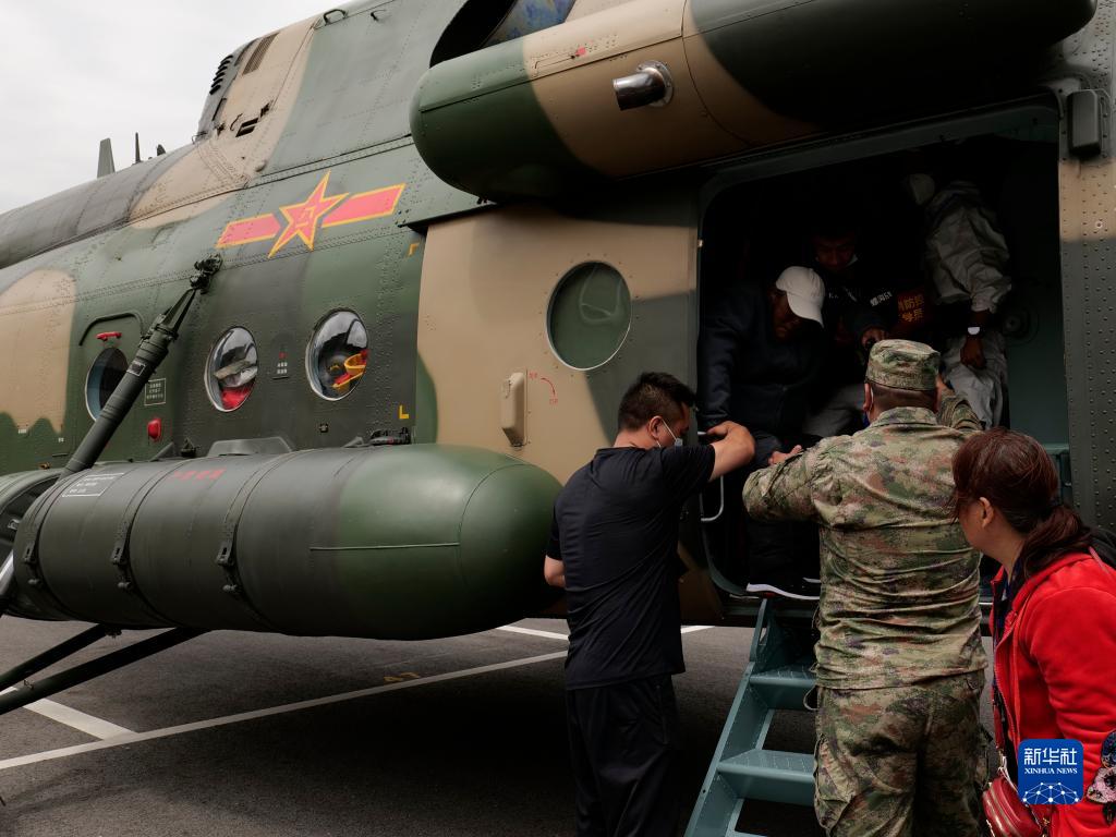 9月6日,西部戰(zhàn)區(qū)空軍某部緊急出動(dòng)直升機(jī)在瀘定縣轉(zhuǎn)移群眾。新華社發(fā)(胡建軍 攝)