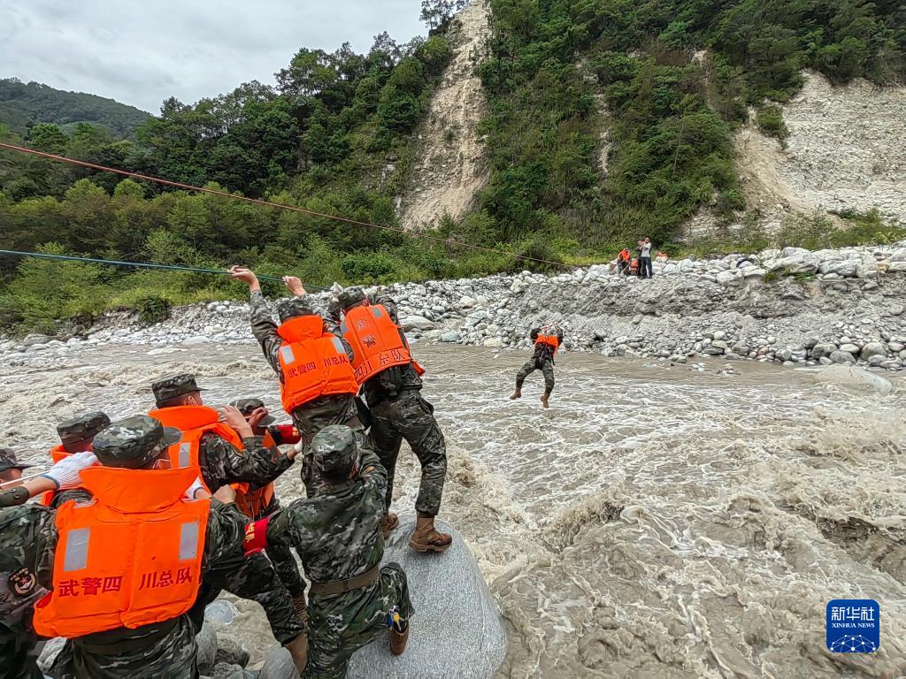 9月6日,武警四川總隊(duì)甘孜支隊(duì)救援官兵在瀘定縣磨西鎮(zhèn)通過(guò)繩索前往河對(duì)岸,救助被困群眾。新華社發(fā)(張文軒 攝)