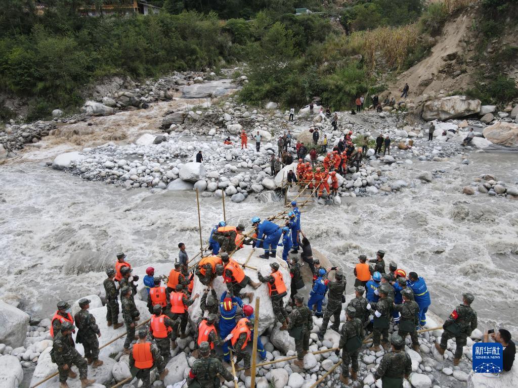 9月6日,武警四川總隊(duì)甘孜支隊(duì)救援官兵在瀘定縣磨西鎮(zhèn)燕子溝河谷,與多方救援力量一起搭建通往磨子溝村的橋梁。新華社發(fā)(葉小龍 攝)
