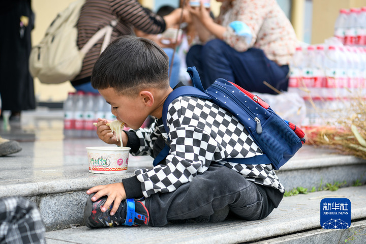 9月6日,在位于石棉縣王崗坪鄉(xiāng)挖角村村委會(huì)的安置點(diǎn),一名小朋友在吃午飯。新華社記者 胥冰潔 攝
